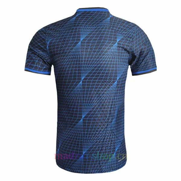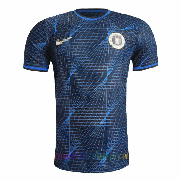 La camiseta Chelsea segunda equipación 23-24 Versión Jugador combina azul marino y azul. La camiseta está cubierta por un estampado geométrico de rombos en azul marino y azul. El logotipo en el pecho es de color blanco. El ribete azul se utiliza en el cuello y los puños. El diseño de la camiseta rinde homenaje a la camiseta de la temporada 2002-03 de hace 20 años.