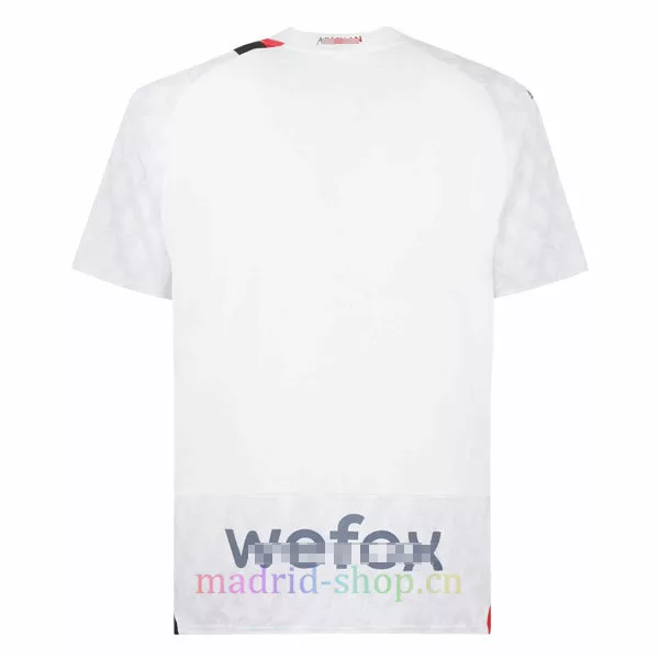 La Camiseta Milan Segunda Equipación 2023-24 está inspirada en la ciudad de moda de Milán. La camiseta utiliza el blanco como colour principal en toda la prenda, con rayas asimétricas negras y rojas añadidas para hacer la camiseta más interesante. El logotipo está plateado.