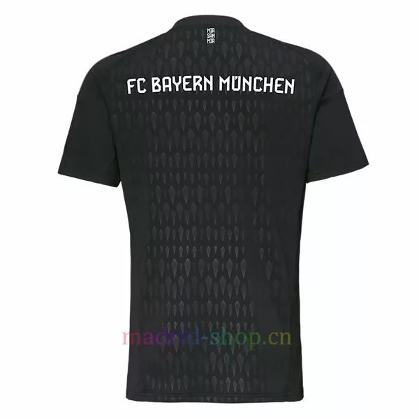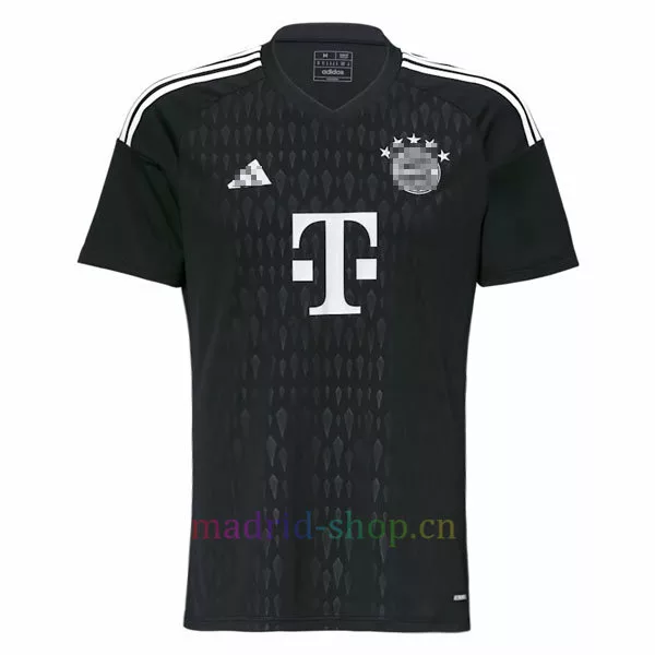 La camiseta portero Bayern 23-24 negro tiene un diseño sencillo, principalmente en negro, con blanco utilizado para las rayas de los hombros. Los logotipos en el pecho son todos de color hueso, un color cercano al blanco de las franjas de los hombros. Las letras y los números siguen estando impresos en blanco.