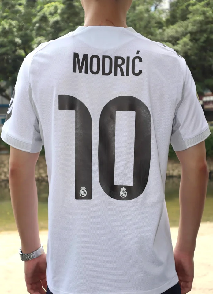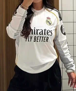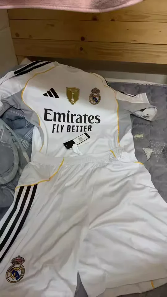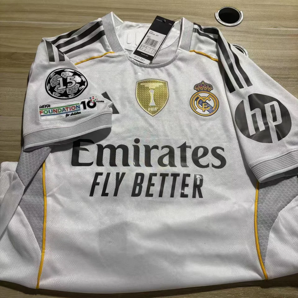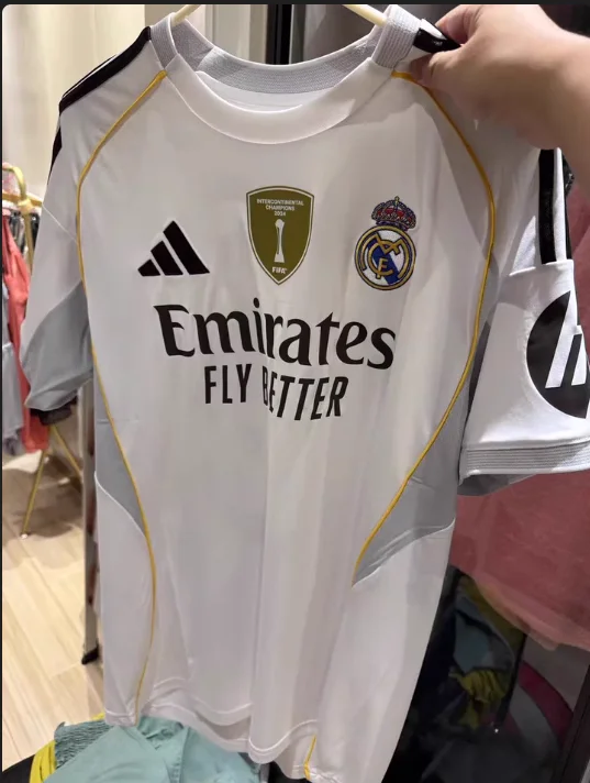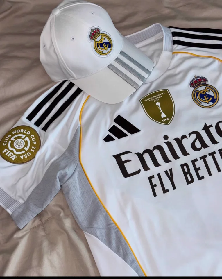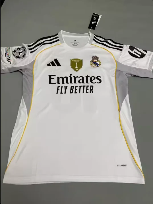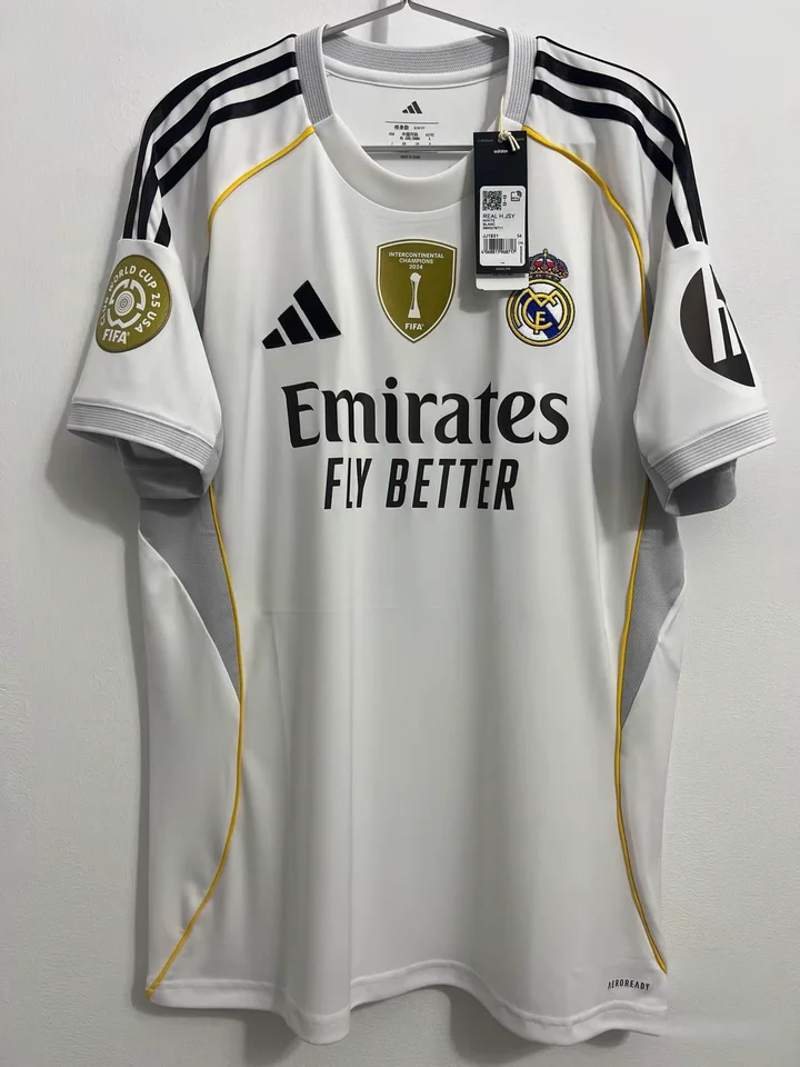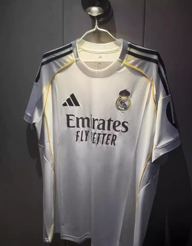 Las imágenes de camisetas Real Madrid 2025-26 son editadas por copyright. El producto real incluye el logo completo y claro.
