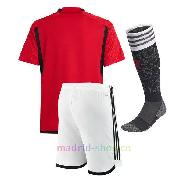 La camiseta Man United primera equipación 2023-24 Niño continúa su tradición de presentarse en rojo en su conjunto, con detalles en negro añadidos en las franjas de los hombros y el escote, y blanco utilizado para el logotipo y los logotipos de los patrocinadores, entre otras cosas.