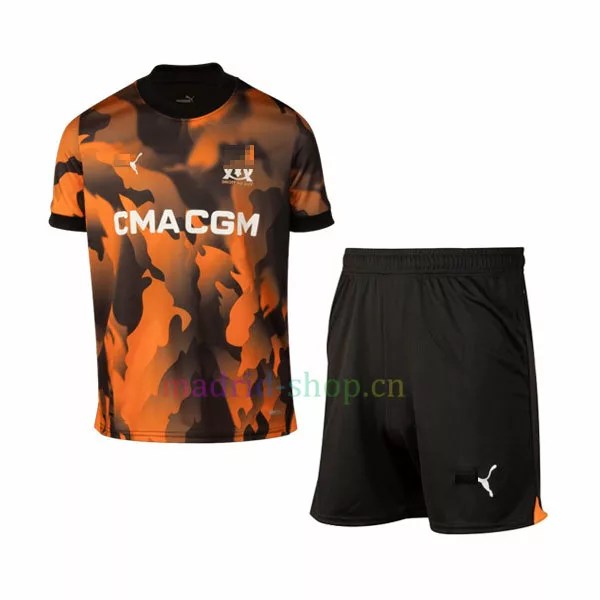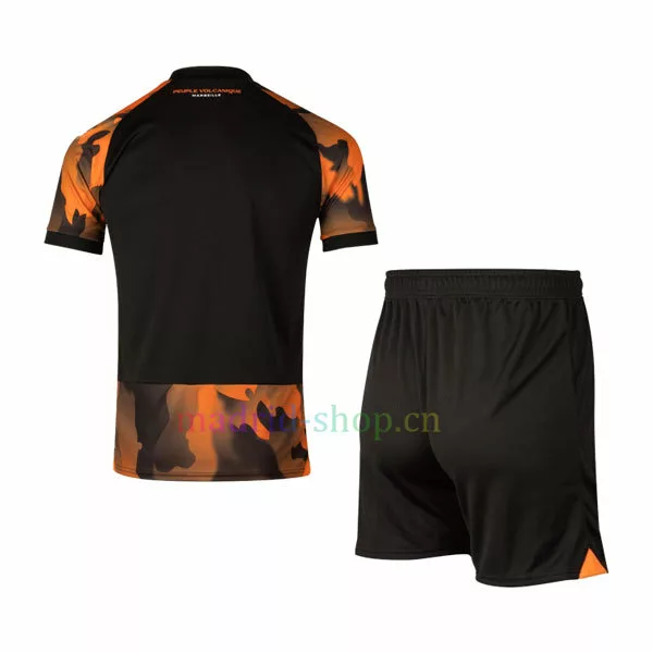 En la camiseta Marsella tercera equipación 23-24 Niño predominan los colores naranja y negro, que dan el efecto de un estampado de llamas. Este diseño refleja el lema de su club: Peuple Volcanique (que significa el pueblo volcánico). Para el logotipo del pecho se ha utilizado el color blanco.
