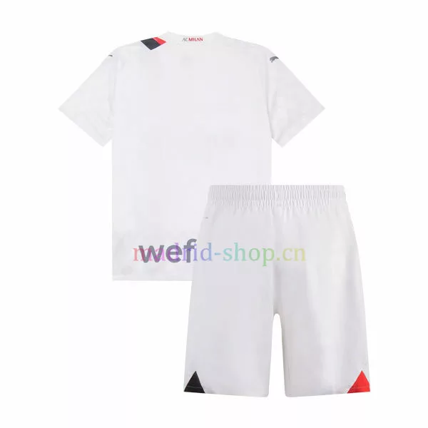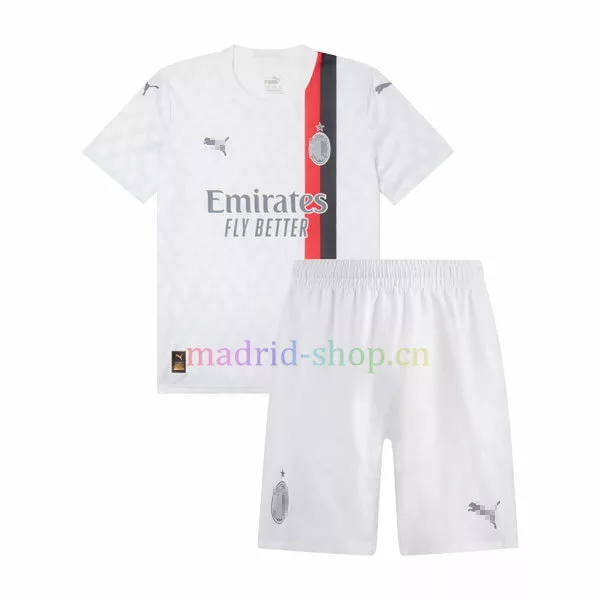 La camiseta Milan Segunda Equipación 2023-24 Niño está inspirada en la ciudad de moda de Milán. La camiseta utiliza el blanco como color principal en toda la prenda, con rayas asimétricas negras y rojas añadidas para hacer la camiseta más interesante. El logotipo es plateado.