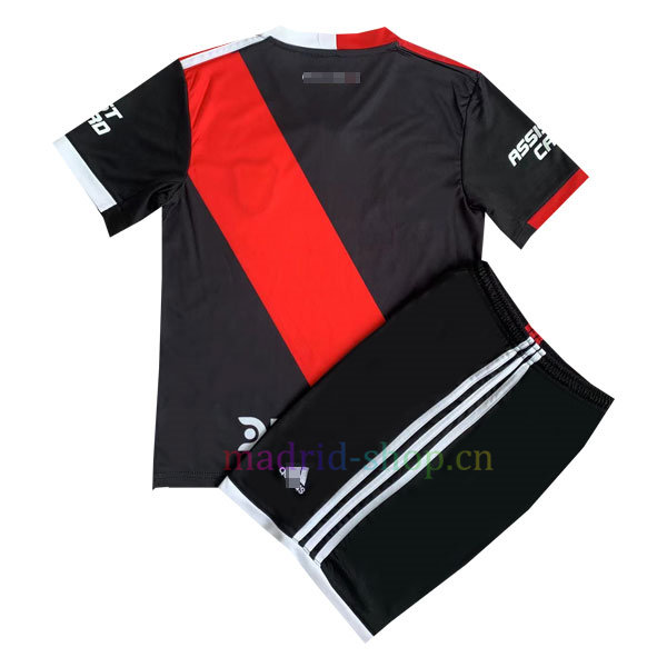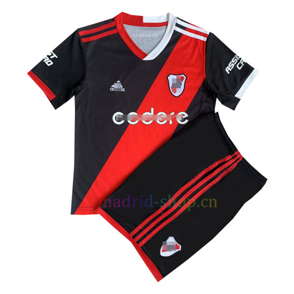 La camiseta River Plate Tercera Equipación 2023-24 Niño es de color negro & rojo y tiene un diseño muy especial; está confeccionado con un tejido ligero que absorbe el sudor, diseñado para mantenerte seco y transpirable cuando lo lleves puesto. Hay un logotipo de la marca claro y regular. Se completa con el logotipo del escudo del River Plate.