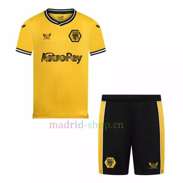 La Camiseta Wolves Primera Equipación 2023-24 Niño está acabada en amarillo con detalles en blanco y negro. Con cuello de pico y puños de canalé, tiene aberturas laterales en el dobladillo para facilitar el movimiento.
